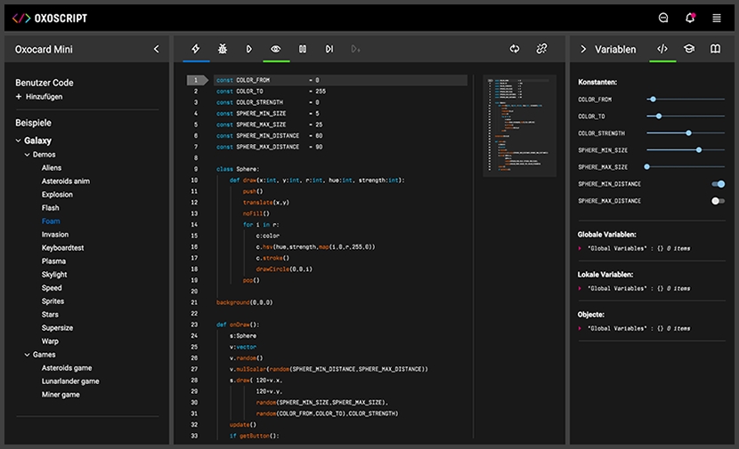 Auf der nur kreditkartengrossen Platine findest du einen hochauflösenden Screen, fünf Taster, sieben Sensoren und einen leistungsfähigen Computerchip, den du direkt via Browser programmieren kannst.