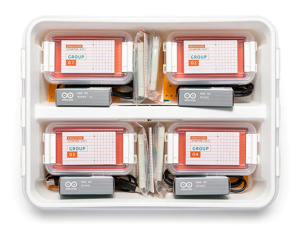 The Arduino Education Starter Kit contains all the hardware and software you need for eight students (in groups of 2). You get step-by-step-lessons, teacher notes, exercises, and for a complete and in-depth class experience there’s also extra optional resources including activities, concepts, history, and interesting facts.