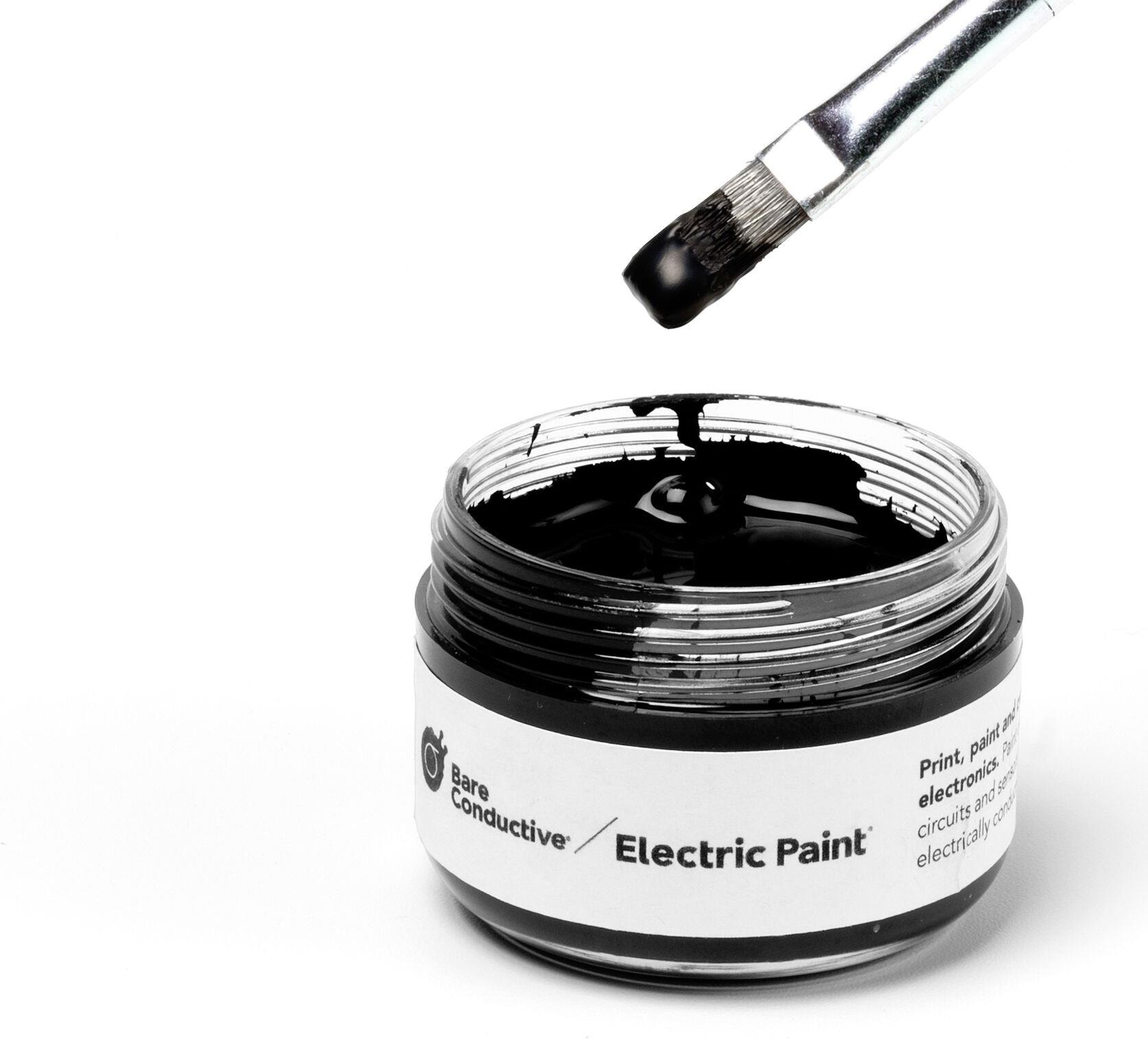 Die elektrische Farbe von Bare Conducive Electric Paint verhält sich ähnlich wie wasserlösliche Farbe, ist aber elektrisch leitfähig. Das heisst, dass Leiterbahnen oder Sensoren direkt auf eine Vielzahl von Materialien gezogen werden können. Dazu gehören Papier, Holz, Plastik und Glas. Ähnlich wie gewöhnliche wasserlösliche Farbe, kann die elektrische Farbe zum Malen, Siebdruck, Schablonieren oder Aquarellieren verwendet werden.
