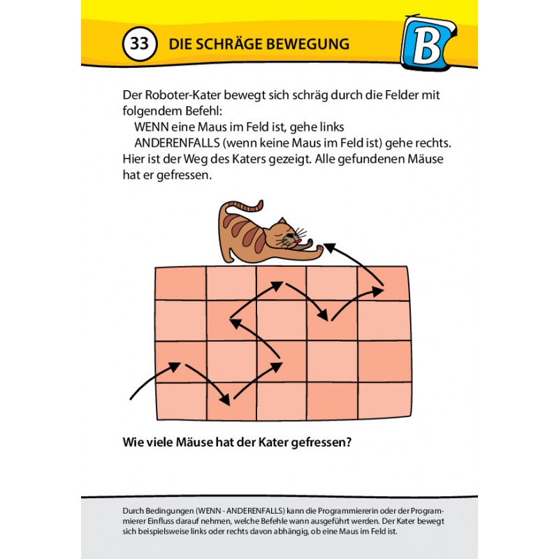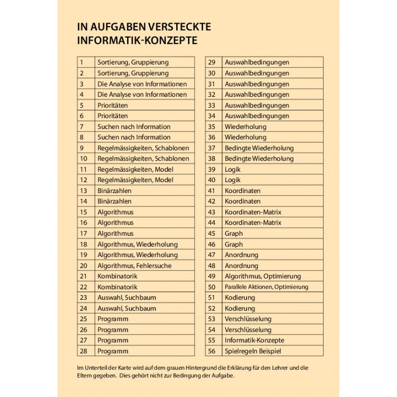 Die Karten sind leicht verständlich und laden zum Knobeln ein. Zudem gibt es auf jeder Karte eine kurze Erklärung, wie diese Aufgabe mit der Informatik zusammenhängt. In der Klasse oder in einer Gruppe kann es darüber hinaus sehr spannend sein die Lösung, die man gefunden hat, den Mitschüler:innen zu erklären. Das schult das klare Formulieren und das Argumentieren anhand von nachvollziehbaren Überlegungen und damit das Überzeugen der anderen Kinder von der eigenen Lösung. Dies ist eine Fähigkeit, die über alles Fachwissen hinaus im Leben wichtig ist und bleiben wird. Es gibt deshalb auch keine Lösungsblätter und die eine oder andere Karte hat mehr als eine Lösung. Viel Spass beim Knobeln und argumentieren!