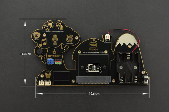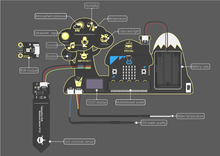 Environment Science Board for micro: bit is designed with highly symbolic trees, houses, and snowy mountains. On a wide and easy-to-use PCB, it integrates many sensor modules of nature and science. Including UV sensor, temperature sensor, humidity sensor, air pressure sensor, sound sensor, color sensor, light sensor, water temperature sensor, TDS water quality sensor, buzzer, OLED display, etc. This kit is rich in knowledge, including a wide range of applications. It is initial to observe and ease to play. Extended GPIOs are set and it supports gravity series sensors. The bottom is designed with PMMA (acrylic) to enhance the ease of use and durability. It supports Makecode and Mind + platforms.