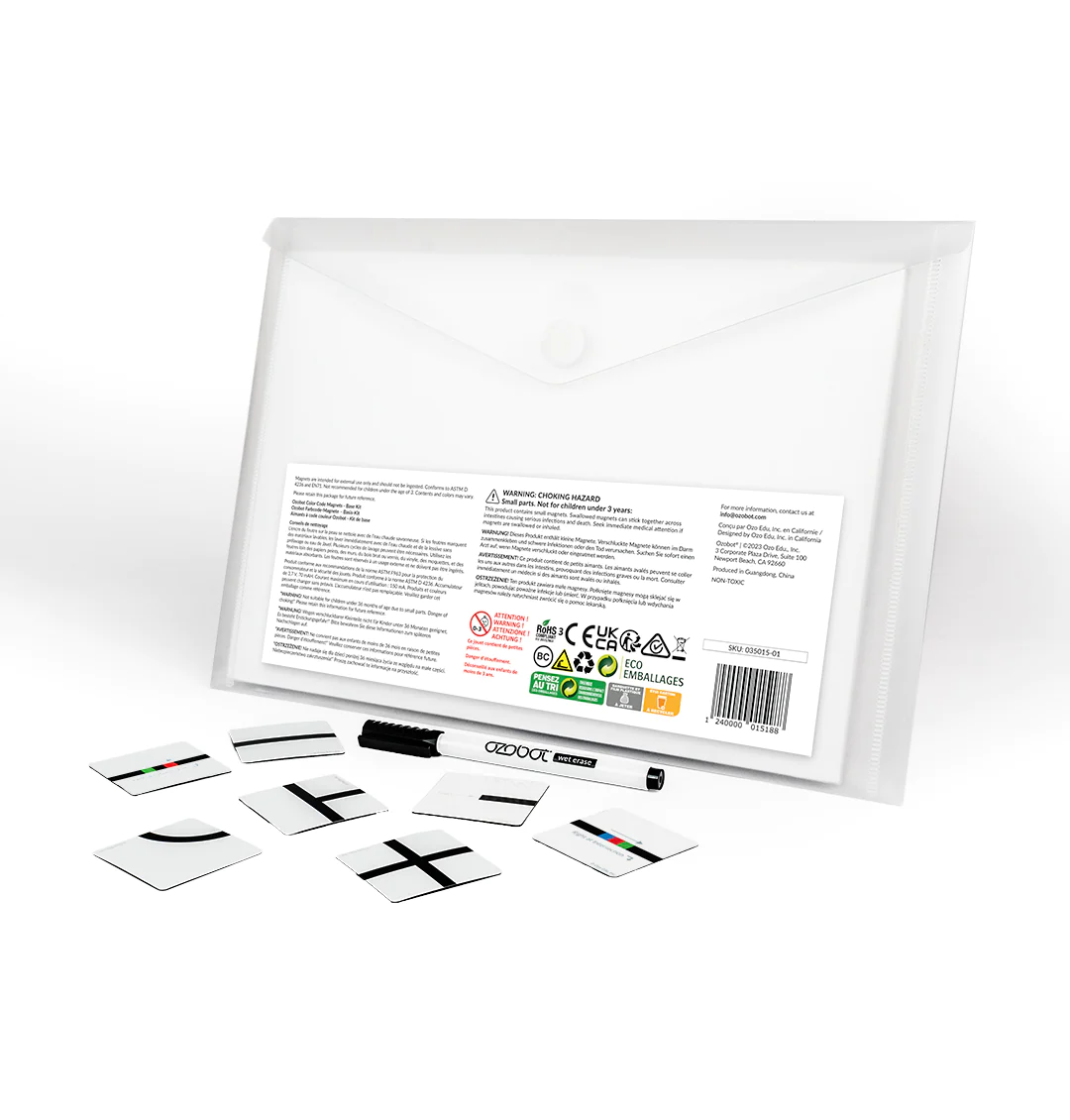 Durch eine Kombination aus Ozobot-Farbcodes und Teilen, die Linien folgen, erlaubt das Basis-Kit den Schüler:innen, mit Reihenfolgen, Logik und Problemlösungsfähigkeiten zu experimentieren. Die Farbcode-Magnete sind angemessen dimensioniert und einfach zu handhaben, ideal für junge Lernende, die gerade erst in die Welt des Codierens eintauchen.