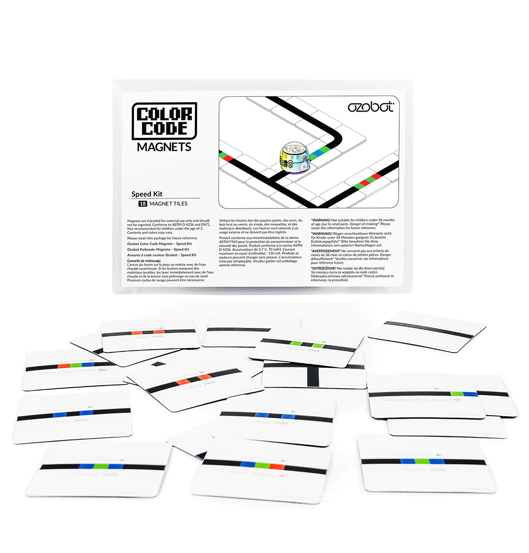 Ozobot Color Code Magnete bieten eine unterhaltsame und interaktive Möglichkeit, Programmierprinzipien schon im Vorschulalter zu vermitteln. Das Speed Kit umfasst 18 Puzzleteile, die mit dem Color Code Magnete Basis-Kit und einem Ozo-Roboter kombiniert werden können. So entsteht eine praxisnahe Lernerfahrung, die die grundlegenden Konzepte der Codierung einführt und zusätzliche Farbcodes für erweiterte Lernmöglichkeiten bietet.