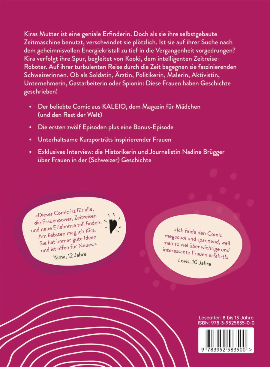 Reise mit Kira durch die Zeit und begegne Frauen, die Schweizer Geschichte schrieben! Kiras Mutter ist eine geniale Erfinderin. Doch als sie ihre selbstgebaute Zeitmaschine benutzt, verschwindet sie plötzlich. Ist sie auf ihrer Suche nach dem geheimnisvollen Energiekristall zu tief in die Vergangenheit gereist? Kira verfolgt ihre Spur, begleitet von Kooki, dem intelligenten Zeitreise-Roboter. Auf ihrer turbulenten Reise durch die Zeit begegnen sie faszinierenden Schweizerinnen. Ob als Soldatin, Ärztin, Politikerin, Malerin, Aktivistin, Unternehmerin, Gastarbeiterin oder Spionin: Diese Frauen haben Geschichte geschrieben!