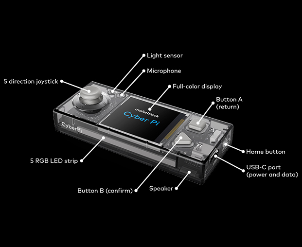 Konzipiert für jeden Studenten, der etwas über Informatik und MINT lernen möchte. CyberPi ist ein Einplatinencomputer, der vollgepackt ist mit fortschrittlichen elektronischen Sensoren, Aktoren und Kommunikationsmodulen. In Kombination mit dem mBlock-Codierungseditor unterstützt es sowohl die blockbasierte Codierungssprache als auch die textbasierte Programmiersprache Python. Lernen Sie im Unterricht Themen wie künstliche Intelligenz, Datenwissenschaft, Netzwerke und das Internet der Dinge.