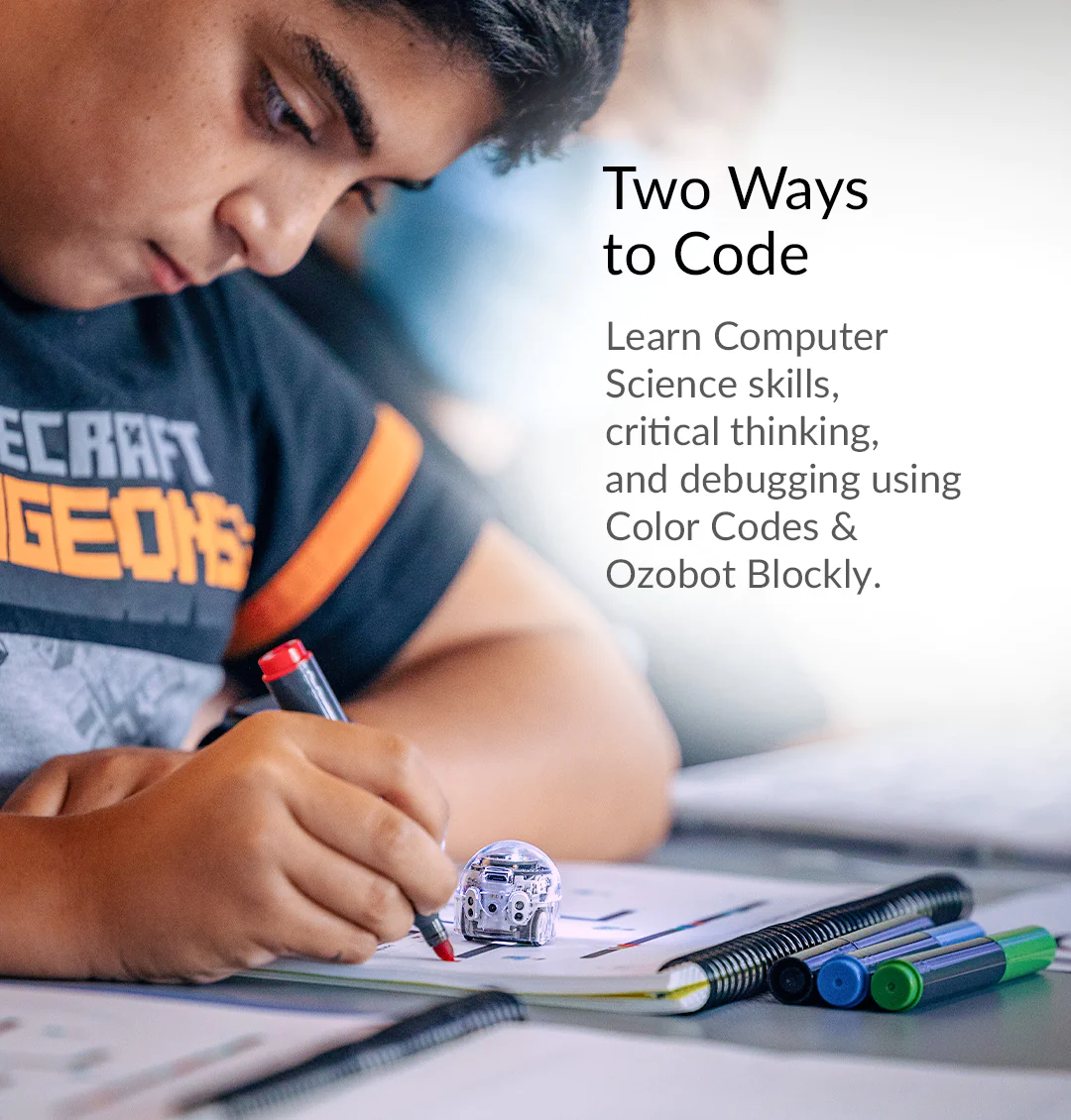 Bringen Sie sich Evo auf zwei Arten bei: online mit OzoBlockly und ohne Bildschirm mit Color Codes. OzoBlockly, das von Googles Blockly unterstützt wird, bietet fünf Schwierigkeitsstufen, für Anfänger bis hin zum Meister der Codierung. Color Codes, die mit Markern auf Papier erstellt werden, vermitteln grundlegende STEAM-Fähigkeiten, kritisches Denken und Fehlersuche.