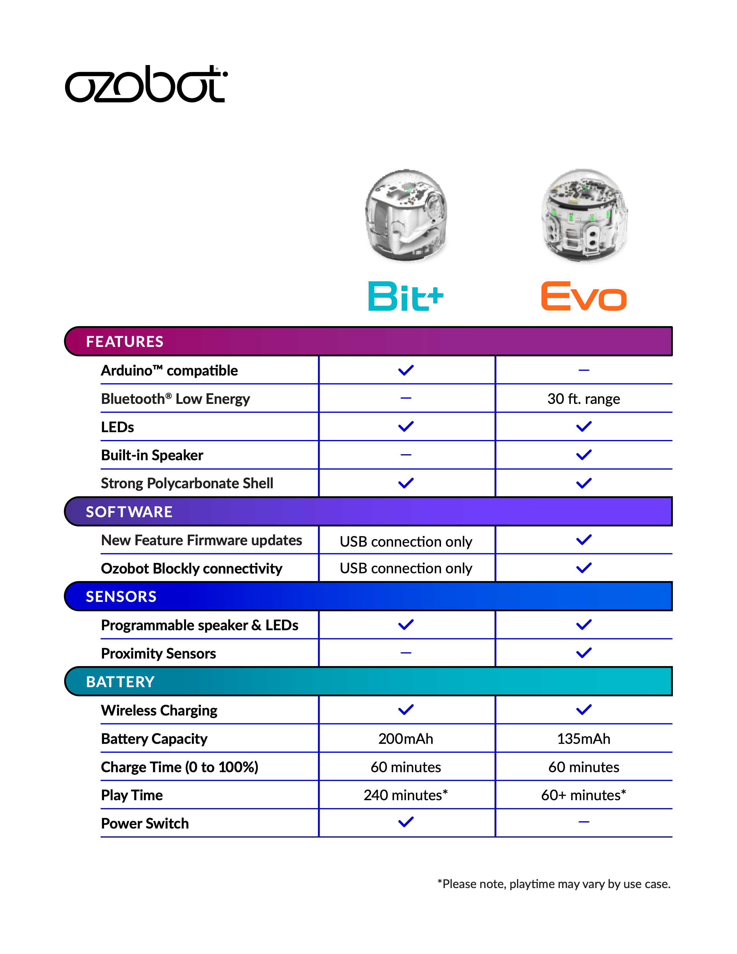 Mit dem Bit+ Entry Kit kann man sich das Programmieren und die Kreativität nach Hause oder in dein Klassenzimmer holen und sich das Programmieren mit Ozobot Bit+ auf zwei Arten beibringen: 1. online mit Ozobot Blockly 2. ohne Bildschirm mit Farbcode-Markern Ozobot Blockly bietet fünf Schwierigkeitsstufen für Anfänger bis hin zu Meister-Codierern. Die Farbcodes lehren grundlegende ICT-Fähigkeiten, kritisches Denken und Fehlersuche. Geeignet für 1 Lehrer und 1-2 Schüler der Klassenstufen Zyklus 1 & 2.