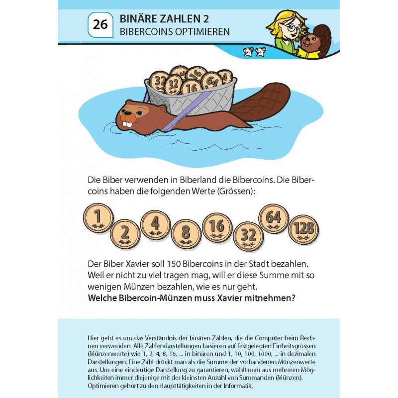 Die Biber-Karten sind inspiriert vom Informatik-Biber-Wettbewerb. Die Knobelaufgaben hier sind originell und waren bisher nicht Teil des Wettbewerbes. Beim Informatik-Biber-Wettbewerb lösen Kinder Aufgaben mit informatischem Hintergrund. Der Wettbewerb findet einmal im Jahr online statt. 2018 haben 2,7 Millionen Kinder aus 53 Ländern teilgenommen, davon waren über 21 000 aus der Schweiz. Die Schweiz macht seit 2010 beim Informatik-Biber-Wettbewerb mit. Der Wettbewerb dauert jeweils 40 Minuten, in denen die Kinder je nach Altersstufe 8 – 15 Aufgaben lösen. Es gibt eine Rangliste, kleine Preise, viel Spass und noch viel mehr zum Lernen. Die Anmeldung erfolgt über die Lehrperson und die Teilnahme ist kostenlos.