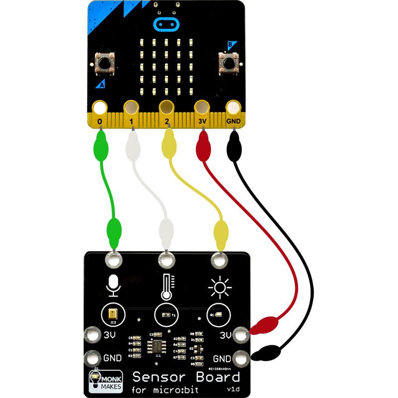 The MonkMakes Sensor Board allows you to detect sound levels, temperature and light levels. It features ring pad connectors for use with crocodile clips make it easy to connect to the board to a microbit.