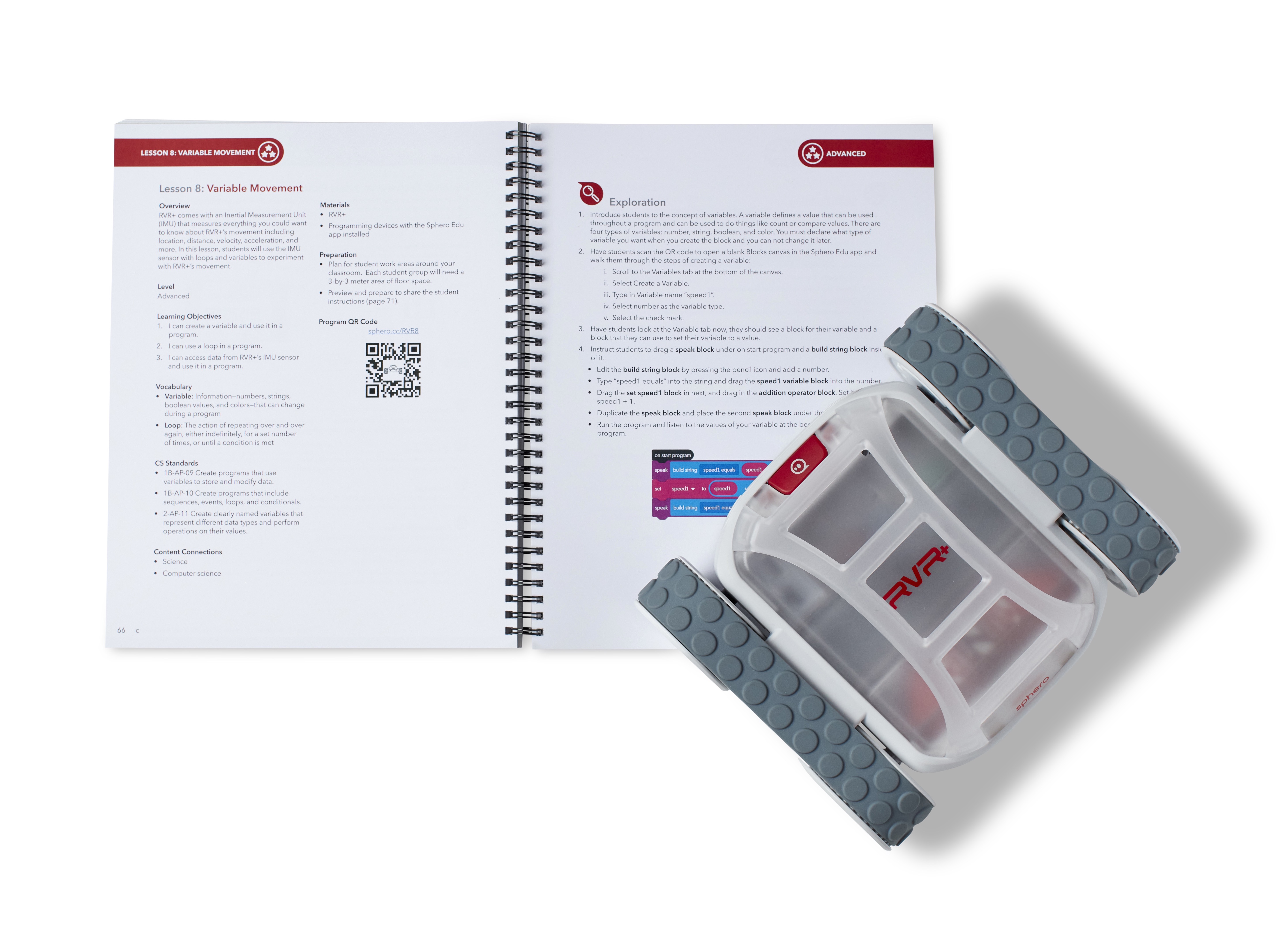 - Programmieren Sie RVR+ mit Draw & Drive, Blöcken oder JavaScript mit der kostenlosen Sphero Edu App. RVR+ kann auch mit dem Sphero Public SDK und API-Bibliotheken für fortgeschrittene Hacker und Maker programmiert werden.
