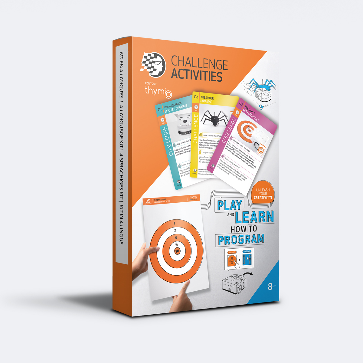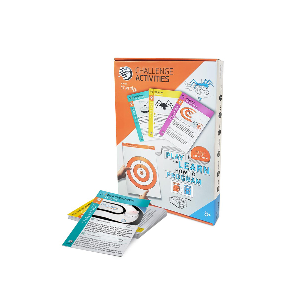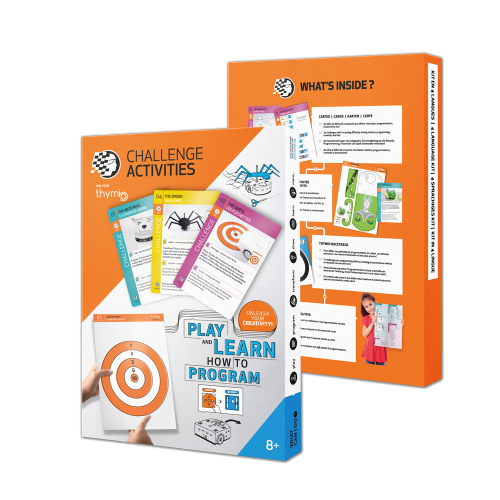 Das Thymio Challenge Activities Accessory Pack enthält 30 herausfordernde Schwierigkeitskarten, um den kleinen programmierbaren Roboter, Zubehör, eine Rennstrecke und einen A2 Guide zu entdecken, um alles über Thymio zu erfahren. Aktivitätskarten umfassen grundlegende Modi, visuelle Programmierung (VPL) und erweiterte visuelle Programmierung. Die Aktivitätsblätter ermöglichen es, den Roboter zu transformieren, Hindernisse zu schaffen und das Spielfeld zu schaffen. Inhalt auf Französisch auf Englisch auf Deutsch und Italienisch. Die Thymio Challenge Aktivitäten bieten die gleichen Aktivitäten wie das Thymio Challenge Pack. Achtung, die Thymio Challenge Aktivitäten enthalten keinen Roboter oder eine Fernbedienung!