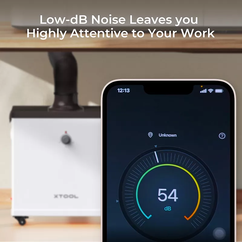 Der xTool-Rauchreiniger verursacht während des Betriebs nicht mehr als 55 Dezibel* und sorgt so für eine ruhige Arbeitsumgebung.