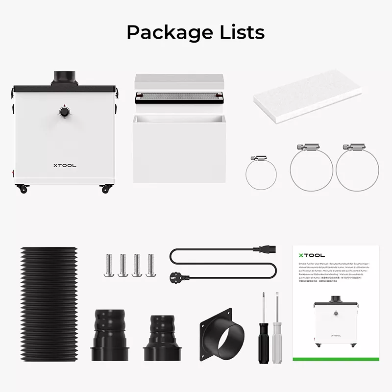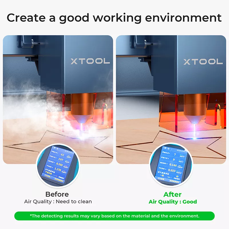 Der xTool-Rauchreiniger (P5010297) verwendet eine 3-lagige Filterung mit hochwertigen Aktivkohle- und HEPA-Filtern, um eine Reinigungsrate von 99,97 % zu erreichen und giftige Dämpfe, Staub und unangenehme Gerüche zu entfernen.
