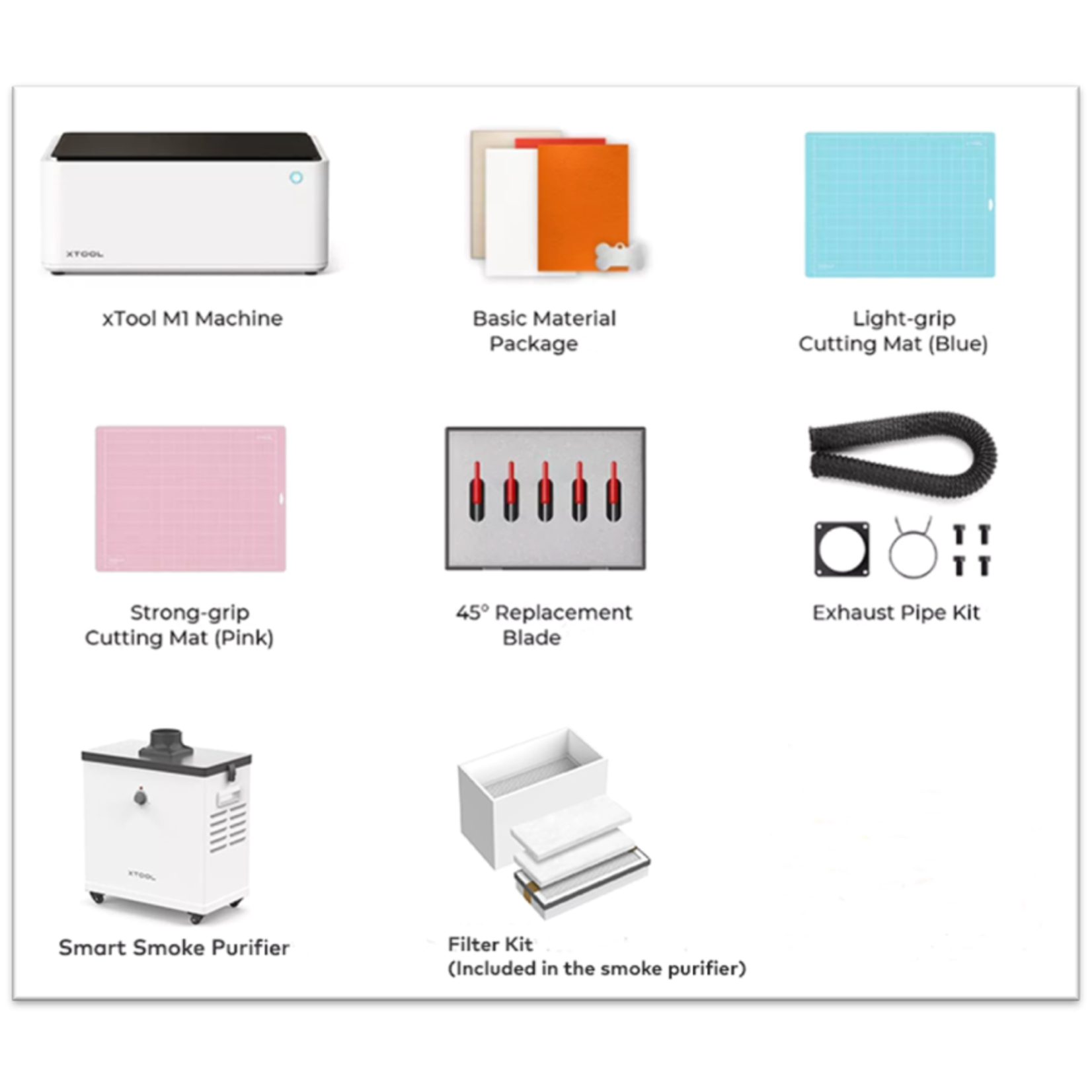 The lid filters out blue light to protect your eyes and the M1 automatically shuts down when the lid is opened. The EU pack comes standard with the xTool smoke cleaner (P5010135).